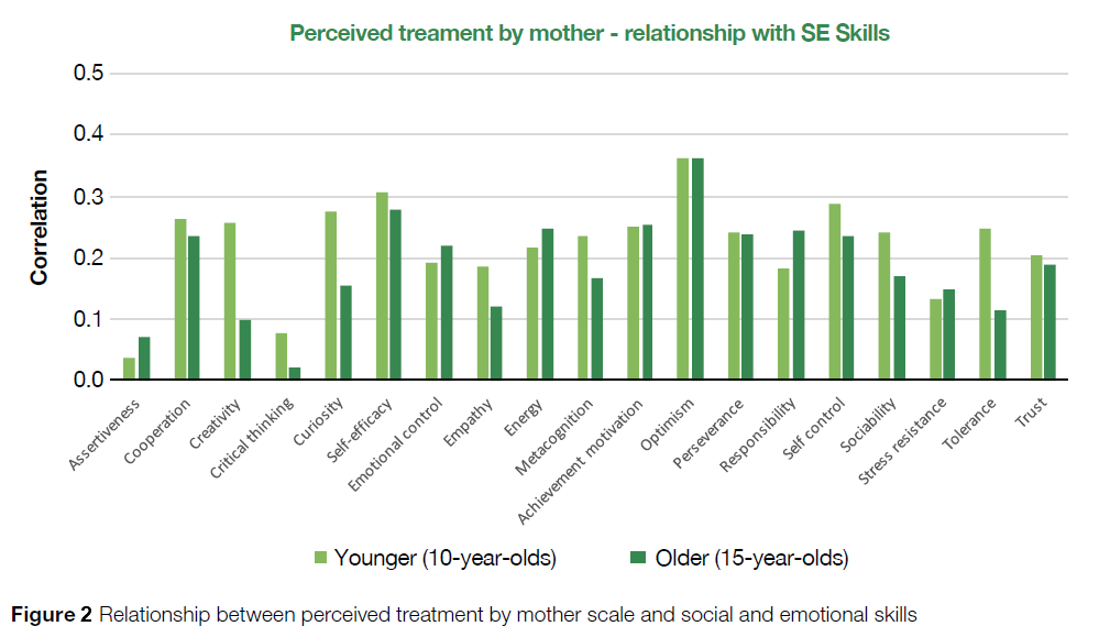 Findings from the field trial are naturally less robust than those expected from the main survey but nonetheless reveal some interesting insights. Take, for example, the perceived treatment by mother scale, which was based on questions like ‘my mother helps me with my problems’ and ‘my mother respects my feelings’. A strong positive correlation was found between perceived treatment by mother and optimism (‘I believe good things will happen to me’) for both the younger and older cohorts, while there were negligible links with assertiveness and critical thinking. See figure 2 for more.
